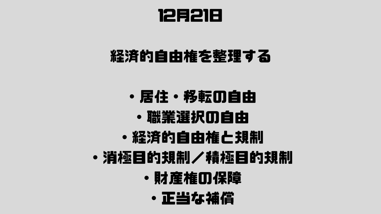 今日は憲法の学習の中でも、日々の生活や経済活動に密接に関わる「経済的自由権」を重点的に進めました。昨日の精神的自由権とは対照的に、この分野は「社会全体の利益(公共の福祉)」との調整が非常に強く求められるのが特徴です。