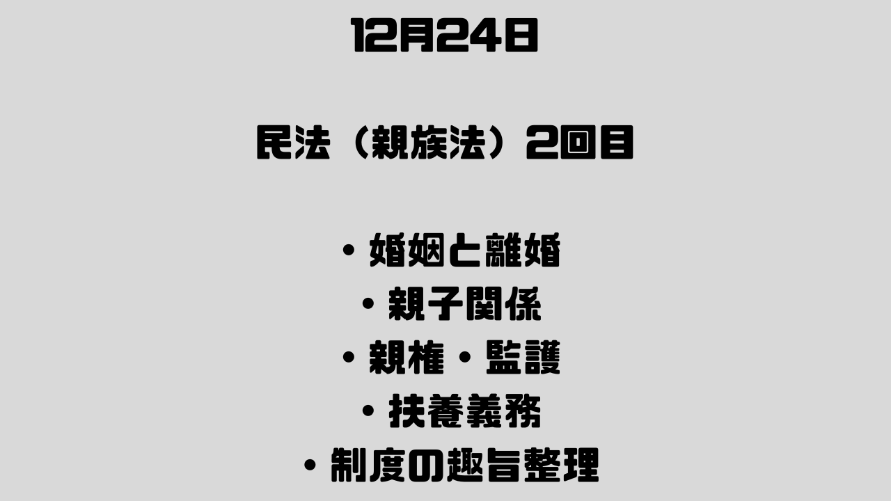 親族法は条文自体は比較的読みやすいのですが、その裏にある「制度の趣旨」や「背景にある考え方」をしっかり押さえていないと、応用問題で足元をすくわれる分野だと改めて実感しています。
