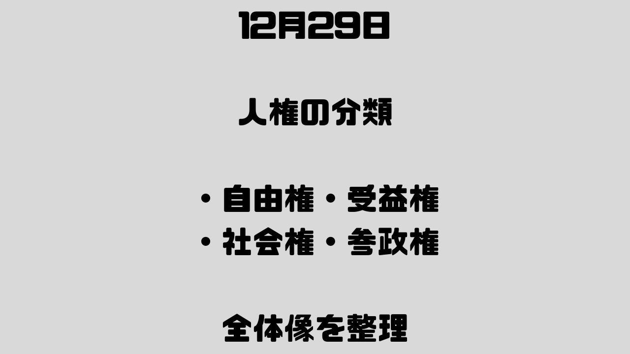 人権を分類する意味は、単なる暗記のためではなく、それぞれの権利が持つ性質や、制約の受けやすさを把握するためだと痛感しました。