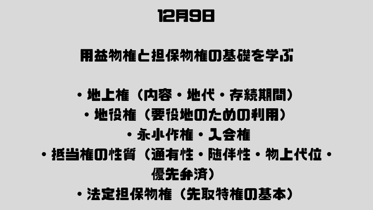 今日はボリュームがありましたが、物権法の**「用益物権→担保物権」**の流れがスムーズに理解できたのが最大の収穫でした。