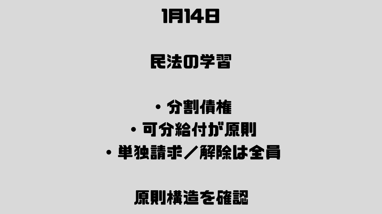 分割債権は「原則」だからこそ、後で学ぶ「不可分債権」や「連帯債権」との違いを際立たせるための重要な土台になります。まずはこのサッパリした原則を頭に置いて、明日以降の「例外的な強い結びつき」を整理していこうと思います。